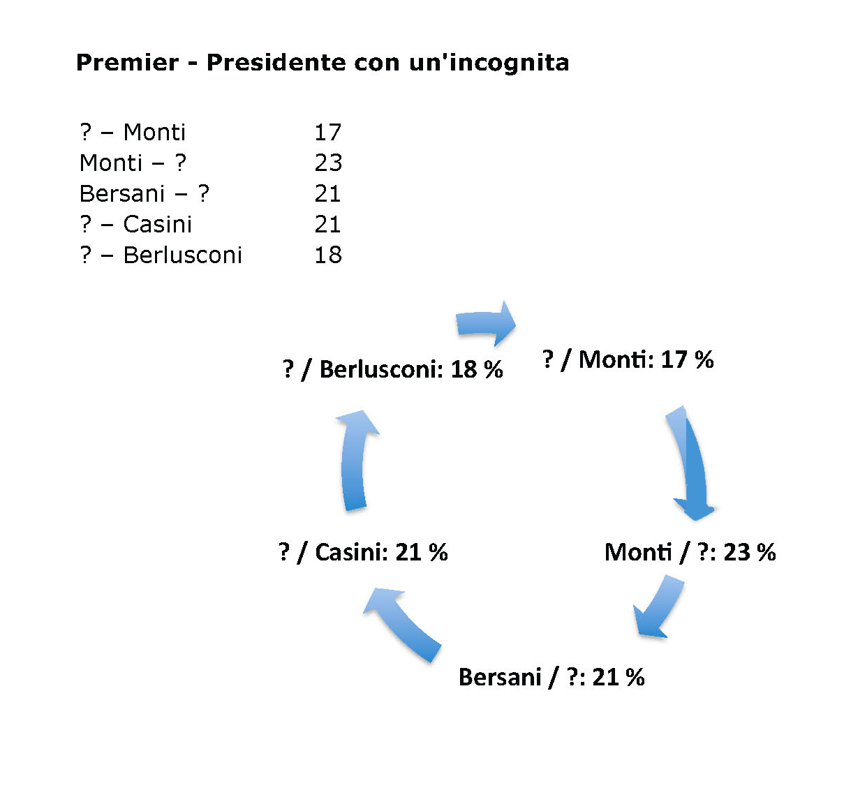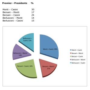 Però, dalle risposte sembra essere passato a livello sociale il “montismo”, non so se per consapevolezza di un’amara medicina oppure se per mancanza di opposizione reale. O per meglio dire, è la frammentazione politica che porta al montismo: è l’italica “Grosse Koalition”, con un tutor. D’altronde, se sinora è stato sostenuto – con svariate argomentazioni – dalla troika [Pdl, Pd e Udc], cosa mai si sarebbe capovolto da motivarne l’esautoramento? Le ambizioni dei leader dei partiti non bastano. Il punto è che la troika, come dice il nome stesso, è composto da tre unità e “i posti” qui disponibili – premier e presidente – sono invece due, di cui uno sembra stabilmente occupato da Monti, con versatilità nell’impiego. Basterà ai partiti chiedere i dicasteri e i ministri? Manderanno un tecnico anche al Quirinale [o viceversa?]. Visto che il problema prossimo venturo dovrebbe essere la crescita e il superamento del credit crunch, ci manderanno un imprenditore [Montezemolo, Marcegaglia] o un bancario [Passera]? Di questo, a un prossimo sondaggio.