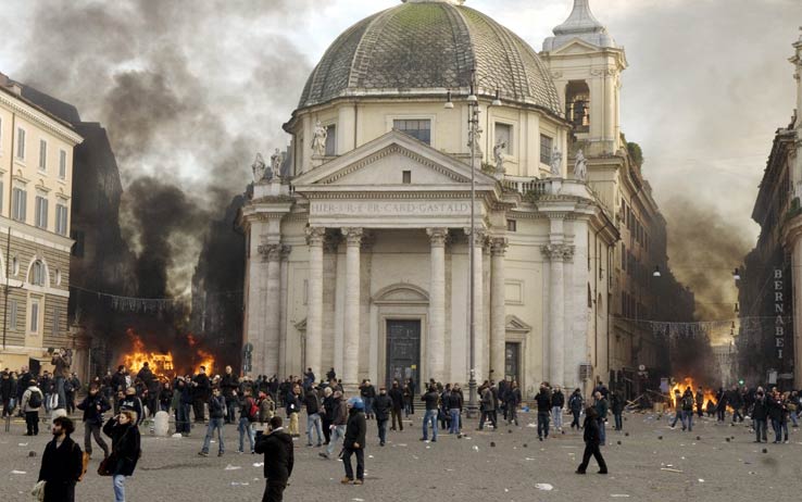 Poi, il 15 ottobre 2011 a San Giovanni una manifestazione finiva in un tumulto e in violenze esasperate. Anche qui, per giorni, prevalse il “colore del reportage”, le madonnine spezzate, i giovanissimi coattelli della suburra romana che nessuno controllava, l’emblematica figura di “er Pelliccia”, il ragazzo che aveva lanciato un estintore e poi si era clamorosamente pentito del suo gesto, le chiacchiere sui black bloc e la violenza: i profondi intellettuali lanciarono un sospiro di sollievo e rassicurarono i politici, se la rivolta era d’er Pelliccia potevano stare tranquilli. A ogni buon conto, per l’uno e l’altro episodio si comminavano decine di anni di galera.